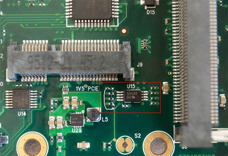Retire o Resistor conforme a figura, e conecto com um fio e um resistor 22 Ohm 0402 no pino 7 do U15. conforme figura abaixo.