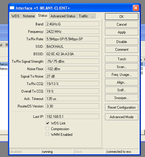 Este AP conecta, através de uma segunda placa wireless, a um AP no 3 º andar. Como você pode ver a força do sinal é boa, mas a qualidade é pobre.
