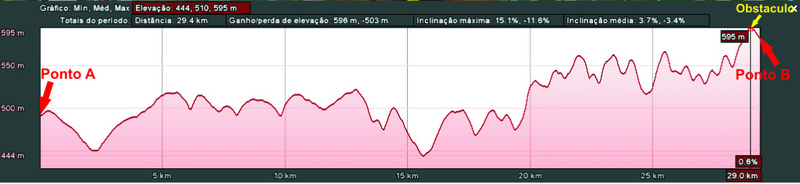 Boa tarde pessoal estou com um ptp para fazer com 29.4Km de distância, irei utilizar para este ptp antenas disco ubiquiti de 30dbi e rocket m5 tbém da ubiquiti, já tenho ptp de 34km com este mesmo equipamento porém em condições de visada mais limpa, e gostaria da ajuda de vcs para me certificar se fecho ou não este ptp q necessito agora, estarei mandando junto ao post uma imagem de elevação obtida pelo Google Earth, lembrando que no Ponto A a elevação do terreno é de 491 mts e tenho neste ponto uma torre com 29 mts (Lat. 24°16'56.38"S Log. 53° 4'32.64"O) no Ponto B a eleveção do terreno é de 586 mts e neste ponto irei colocar uma torre de 30 mts (Lat. 24°11'18.85"S Log. 52°48'17.91"O) o único obstáculo que tenho é próximo ao Ponto B, porém é área de plantio, ou seja não existem árvores.
