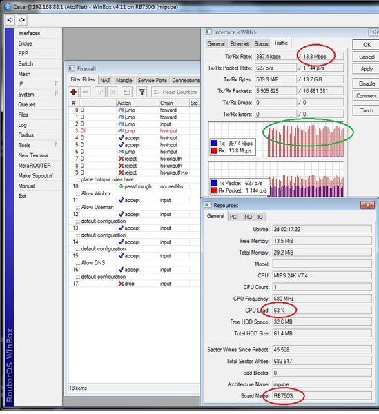 Quando uso o link para download fica assim, nesse momento só tem a minha conexão ativa... também é possível ver o download em rajada (no circulo verde). No caso do firewall só existem essa regras e no NAT apenas o que o setup do HOTSPOT configura.