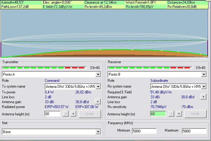 Obs: No rádio mobile eu havia configurado antenas de ganho de 33db, no caso chamei de OIW mas foram as Pluton também de 33db, e o cartão eu havia colocado o XR5 e usei o R52H, mas o objetivo ali era só analisar a visada, que parece ótima, acredito que com o equipamento que usei o resultado teria que ser melhor.
