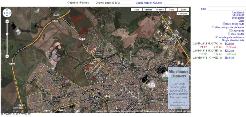 Então, ontem subi no telhado, não dá para ver, tem uns 3 coqueiros na frente... e nos graficos anexos, não considerei a altura do telhado + mastro... Ontem conferi com o GPS a coordenada do ponto A (minha casa, extremidade vermelha) e está em Lat: -22:33:26,86 - Long: -47:26:15,21.