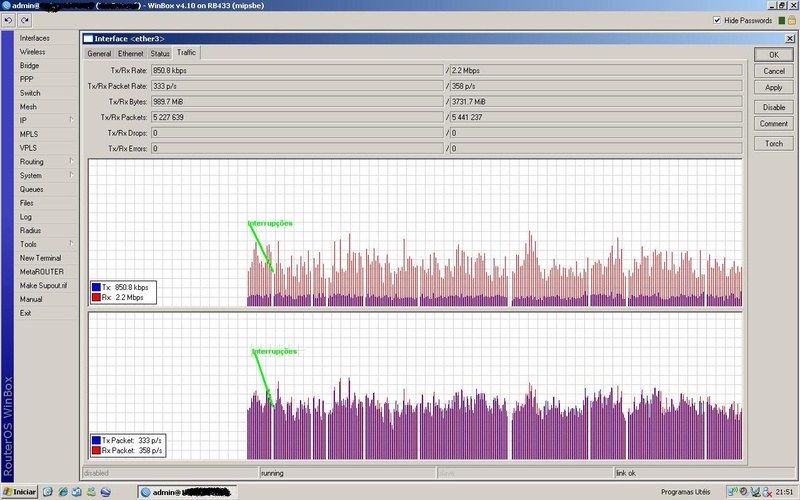 Meu link é da Copel ele fica em outra cidade, haja vista que na cidade que moro não ter disponibilidade, sendo assim fiz uma parceria com um outro provedor desta cidade montamos uma torre juntos e para dividir o link foi colocado uma RB 450 que faz a divisão do link, porém na aba traffic da RB que fica em minha cidade e que é responsavel pelo roteamento deste link está tendo umas interrupções na transferencia de dados, estou utilizando para fazer o PTP dois rockets m5 mais antenas de disco da ubnt de 30dbi, o sinal está em -64 passando 50mb full, será q estas interrupções estão ocorrendo na RB que divide o meu link e o do meu parceiro?