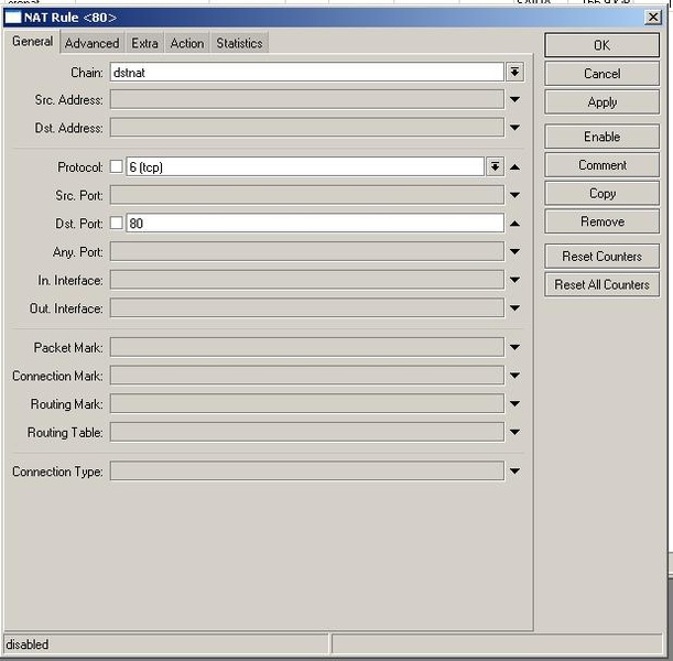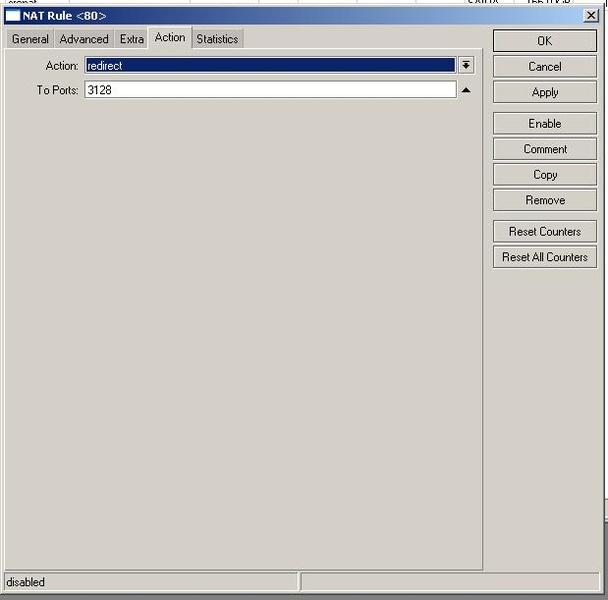 add action=redirect chain=dstnat comment="redirect port 80 to 3128" disabled=yes dst-port=80 protocol=tcp to-ports=3128