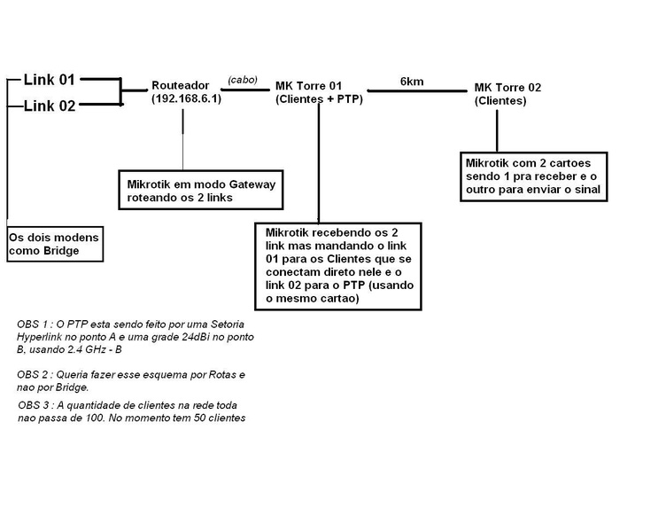 Link - MK1 (Roteador - 192.168.6.1) ---- MK2 Torre 1 (Brige 192.168.6.2 / Clientes) ------- MK3 Torre 2 (Brige - 192.168.6.3 / Clientes)