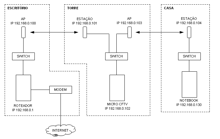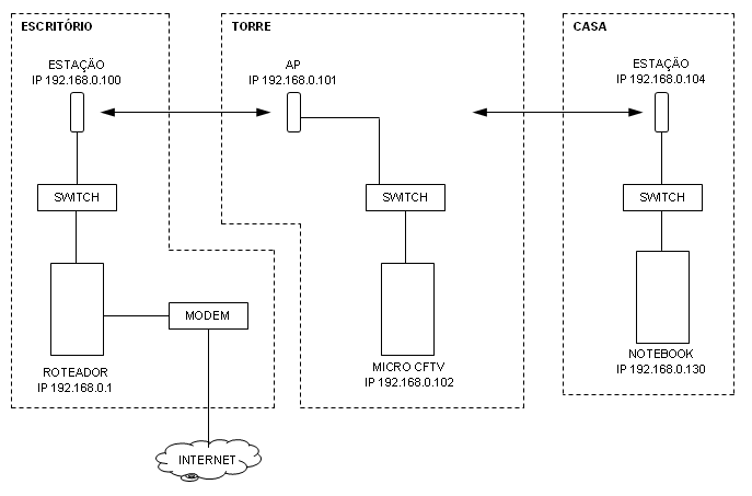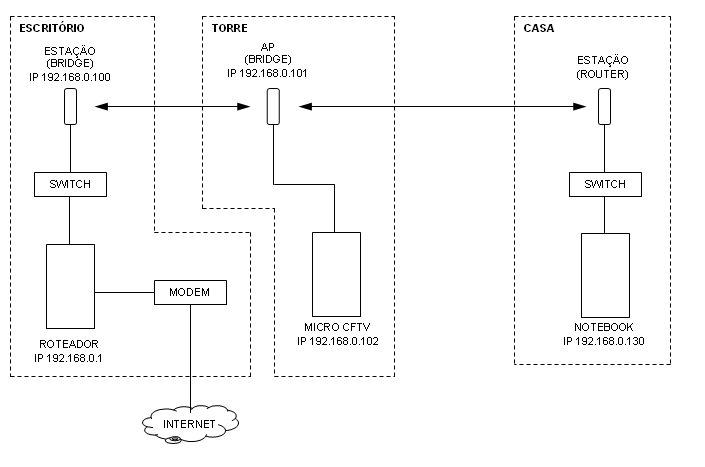 A única coisa que fiz diferente deste esquema é que o notebbok foi conectado direto na antena e não no switch... será que pode ser por isso? Outra coisa: a rede mesmo está no escritório, onde tenho a internet. Quero poder acesar a rede de casa e inclusive a internet.