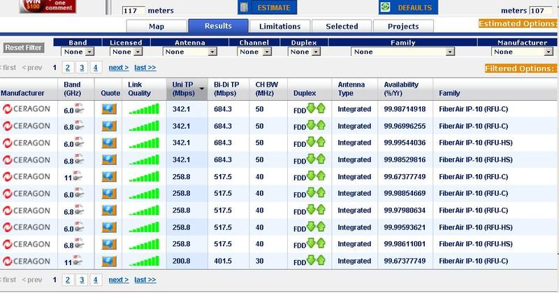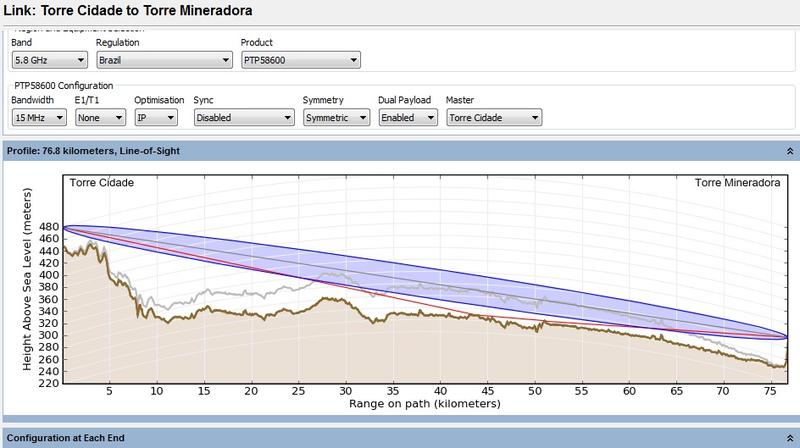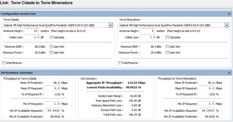 Vou simular mais tarde... Já Vi Rocket M5 fechando com 71km 260/160... antenas 1.40cm.. só nao sei dizer quais antenas..... antes eram ums ptp600 foram substituidos por Rocket...Vou procurar os prints...