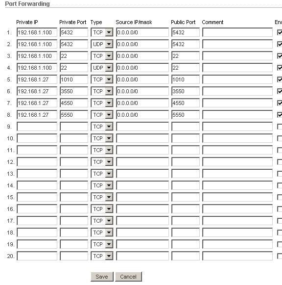 Ip interno, porta interna, tcp ou udp, Source ip/mask (0.0.0.0/0 - vindo de qualquer ip e mascara), porta public, e habilita. Somente salvar as config e testar..
