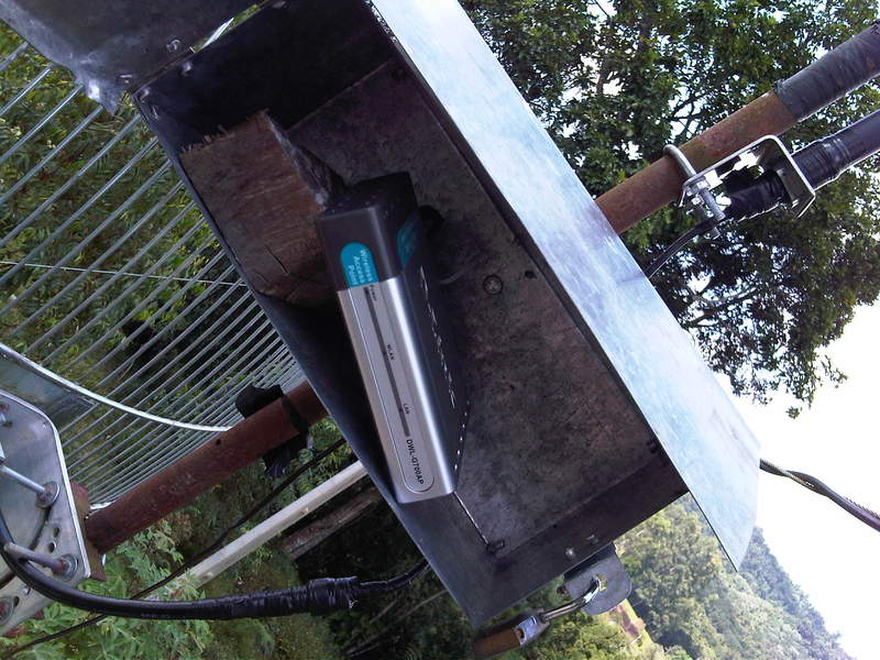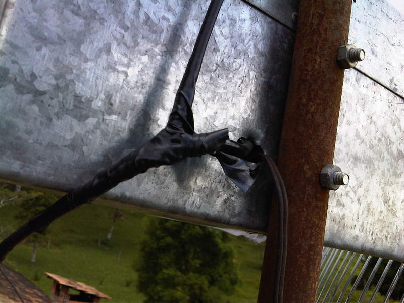 Cabo que vem de dentro ligado ao d-link, cabo que desce em uma grade, cabo que sobe um uma omni, (emenda isolada e soldagem dos cabos feito por profissionais :) ) a quase esquecendo, suporte do radio em madeira nobre.