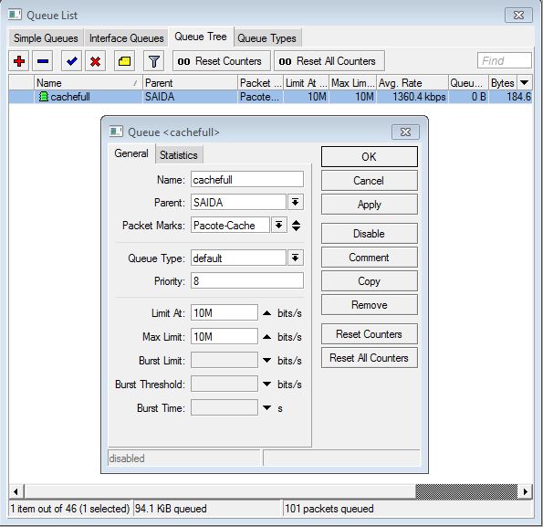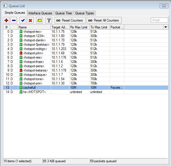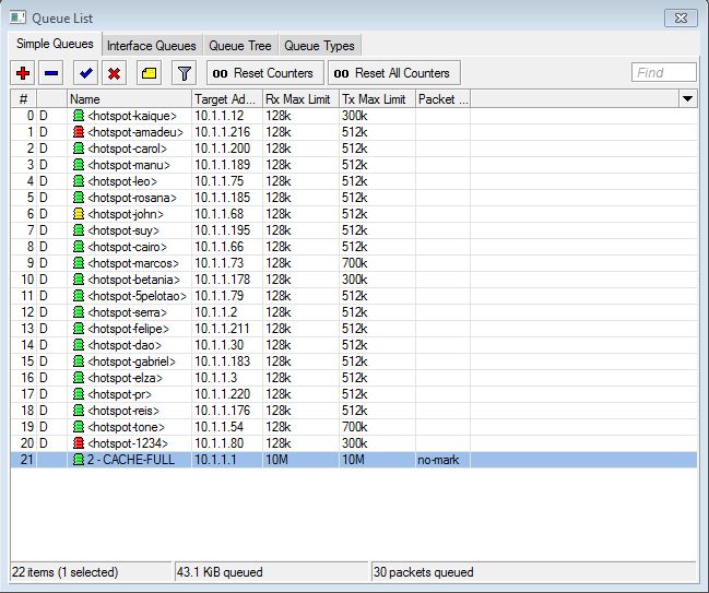 o que mais mim entriga que quando seto a velocidade no hotspot em default não gera perca alguma e o cache desse full trabalha certo, mais quando limito a velocidade e acesso ou faço download o ping aumenta e da percas tmb que o normal é da 1ms mais ele só da isso quando não faço nada na net.