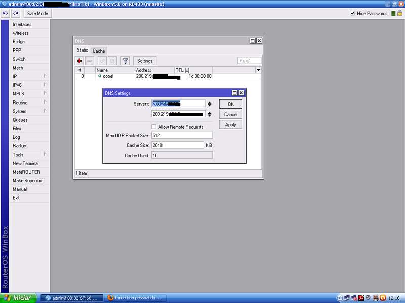 Arauadbr, veja que meu print não tem a oção para dns secundário? Seria a versão de meu mk? Vejo que no seu print tem dns primário e secundário, continuo no escuro igual quando comecei só funciona se configurar ip e dns, mas o brabo é que não adianta ficar inventando faixa de ips, ip fixo não tem disponibilidade de ips a vontade pra digitar nos clientes.