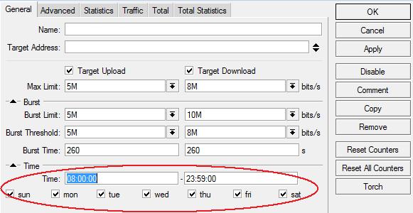 no caso pode usar script para ativar ou desativar a opção "time" em todas as simple queues de uma só vez, ou somente naquelas em que desejar.