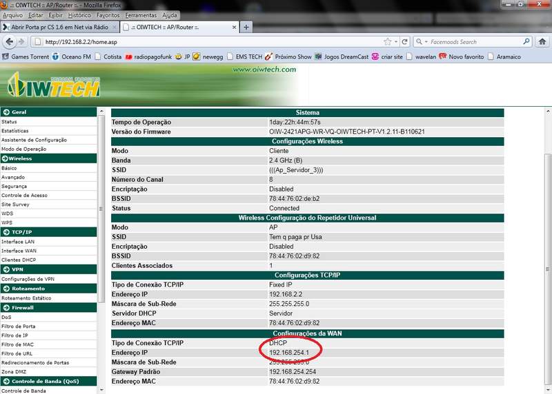 Agora se não funcionar preciso que posta aqui como está configurado o radio cliente. Modo de operação, ip da porta wan e ip do modem adsl.