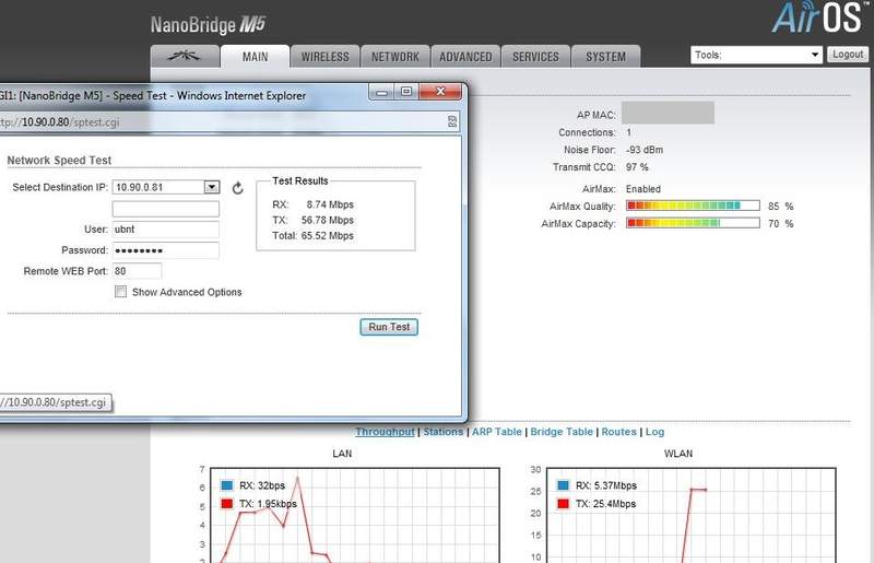 Durante o teste, usei a ferramenta da propria nano para medir o throughtput que chegou a 22mbps segundo o firmware do radio.