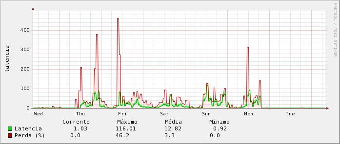 Coloquei criptografia WPA2 neste link. O sinal está excelente, sem muita poluição na frequencia, tudo perfeito. No entanto, os pings em vários momentos ficavam completamente dois, indo de 1 ms para 400 ms e voltando em seguida para 1 ms. As perdas também eram constantes. Como é um link com pouco tráfego, não chegava a me dar muita dor de cabeça, mas de qualquer forma fiquei muito intrigado com isso.