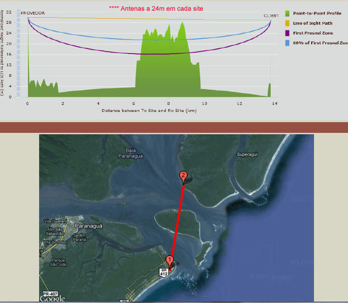 Esse é o cenário com torres de 24m em cada ponta e radios 5.8ghz mimo + antenas dupla polaridade de 32dbi. fecha tranquilo.