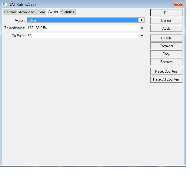 Na aba Action, escolha dst-nat, em To Address digite o IP local do servidor no qual vc quer quer que o redirecionamento caia e em To Port a porta que o redirecionamento deve cair.