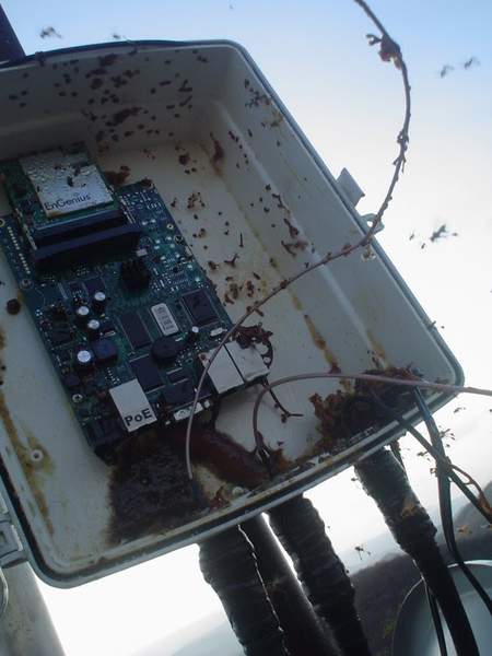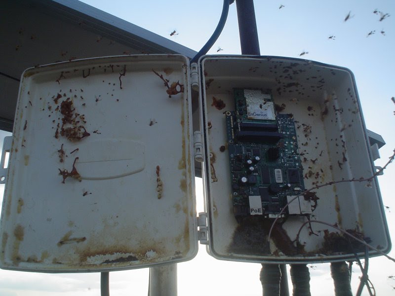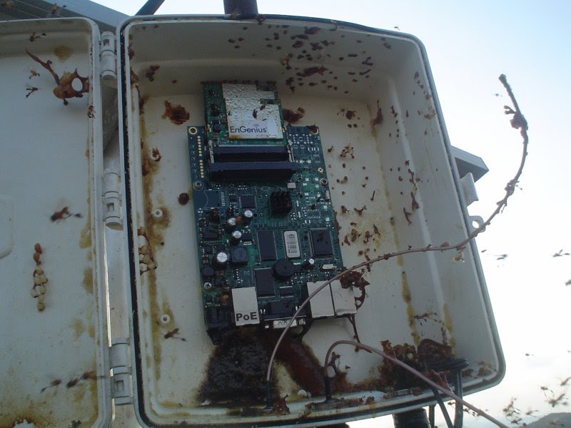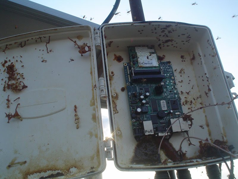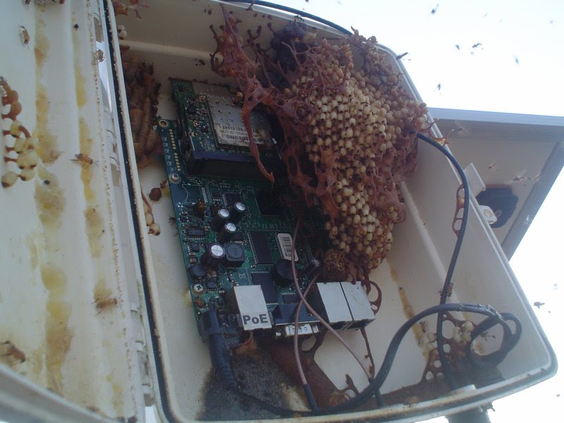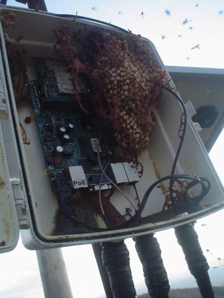 Caros amigos, gostaria de saber se alguem ja passou pelo que estou passando, tenho uma rb 433 com 3 cartões r52, ligada a um painel solar com bateria de carro. Localizada em uma serra no sertão do ceará onde o acesso é altamente dificil, cerca de 2 horas e meia de caminhada no meio da caatinga, faziam 9 meses que nao andavamos lá pois nao tínhamos problemas hoje um de nossos colaboradores subiu e se deparou com uma situação inusitada. A caixa da rb esta completamente cheia de mel de abelha e de abelhas jandairas, a mesma nem abriu toda a porta, de tanta cera de mel.infelismente ele nao levou maquina fotografica para registrar o fato mais na semana que vem estara programado um retorno, onde sera feito todo o registro e postarei aqui pra vcs.