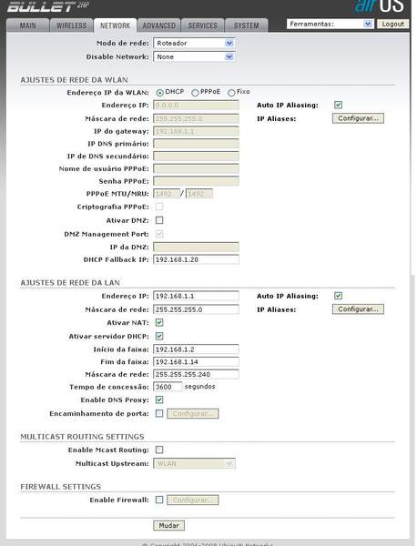 Pelo que percebi com o bullet ligado na casa do meu sogro tá pegando o dhcp por ele. Se eu desligo o bullet eu tenho que ativar o dhcp no dlink.