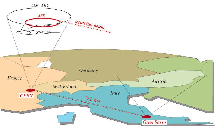 Texto retirado do link a abaixo: By virtue of the oscillation phenomenon, a beam of neutrinos that is initially homogeneous, detected after some time, would contain within it another kind of neutrino. Experiments at the Gran Sasso Laboratories, which use the neutrino beam from CERN, will be able to demonstrate in particular the transformation of muon neutrinos into tau neutrinos, a phenomenon so far never observed. Only muon neutrinos will be produced at CERN, but after 2,5 milliseconds, when the beam arrives at Gran Sasso after having covered about 730km at almost the speed of light, a very small number of tau neutrinos are expected to be detected by the researchers. According to some theoretical calculations, among many billions of billions of muon neutrinos arriving at Gran Sasso, only about 15 tau neutrinos will be identified.