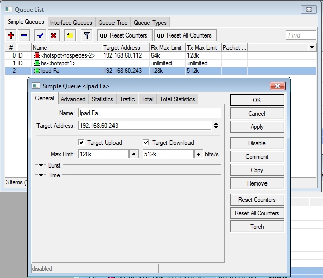 Como o bypassed não controla a banda porque não pega nenhum perfil do hotspot, fui no Simple Queues e criei uma regra manual para um determinado IP, mas a banda não é controlada.