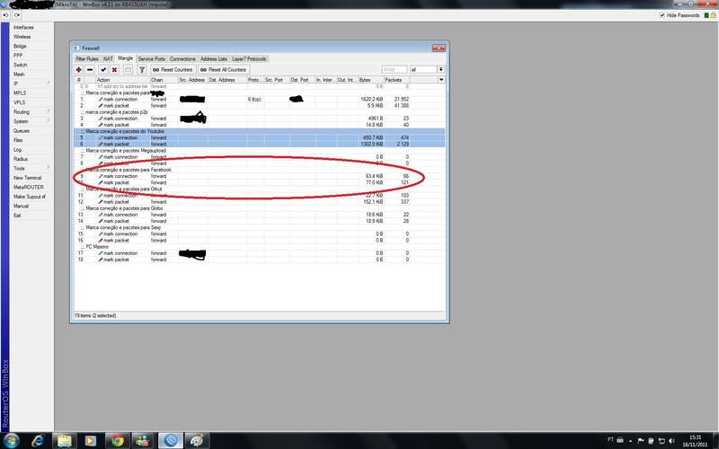 Criei regras no Mangles para marcar conexões e pacotes com conteudo "facebook", "orkut", etc.