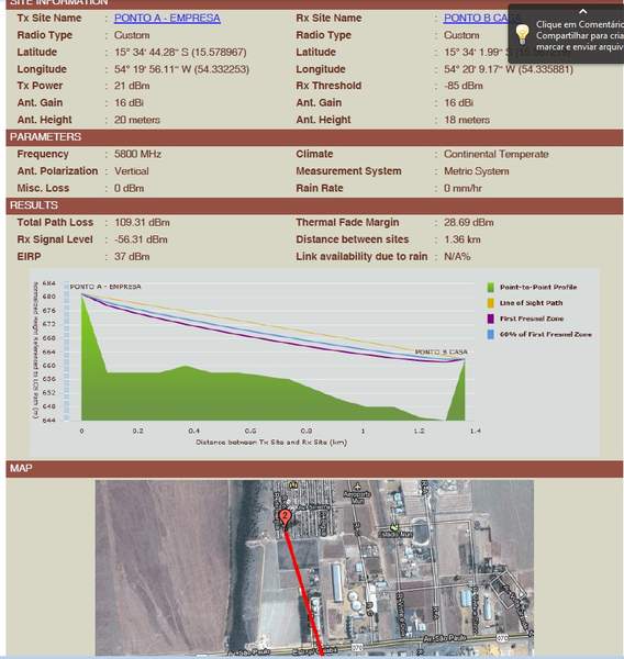 Calculei usando antenas de 16dbi apenas e 21dbm máximo de potencia e fecha sinal em 5.8ghz.