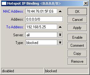 Depois você tem que cadastrar o ip e mac do cliente no hotspost em IP BINDINGS