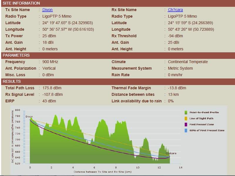 Gostaria de ligar a Internet da minha casa na cidade de 1MB da Oi ( 24º 19' 47.81" S __ 50 º 36' 58.03" O ) com a chácara dos meus pais ( 24º15' 59.71" S e 50º 43' 26.17" O ), olhei alguns equipamentos bacanas no site da Aquario GridStation CPE 2425, em 2.4 GHz e pensei em comprar dois, porém não tem visada direta e o terreno ondula bastante, com morros no intervalo conforme analisei em 3D no Google Earth. Sei que existem programas como RadioMobile e o da Motorola, mas não consegui baixá-los. Não sei qual frequência utilizar neste percurso, 900MHz, 2.4 GHz ou superior. Pretendo instalar em cima da lage da coordenada (1 andar) acima, que não é uma região baixa na cidade e a outra na chácara em um cano de 5 metros na chácara. Alguma dica de frequência e sugestões de equipamentos? Se alguém puder simular e dar as dicas ficarei muito grato! Muito obrigado