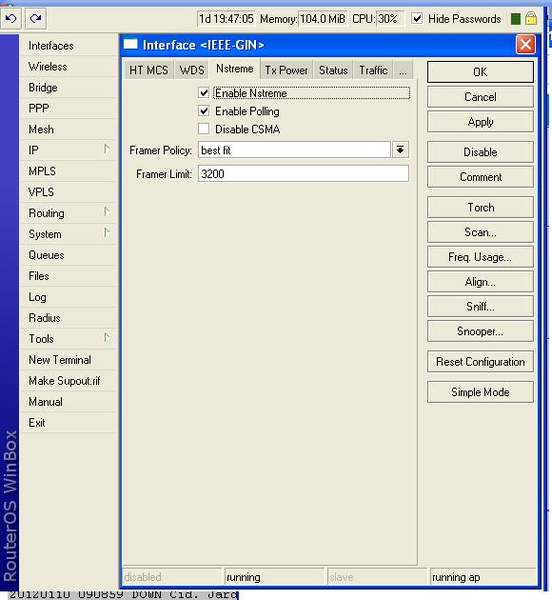Caso não tenha, tente usar apenas o WDS ou o Nstreme. Deixe a opção Frequency mode em manual txpower.