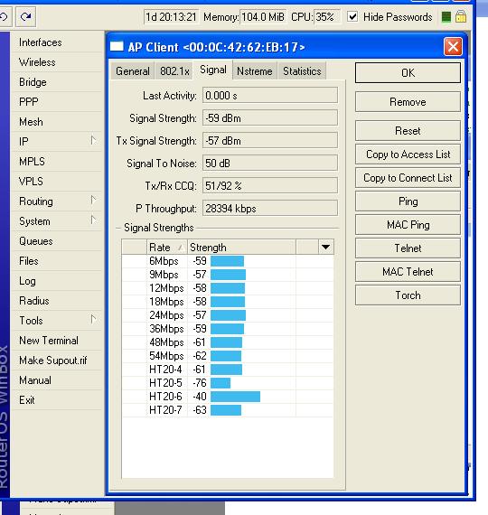 Aqui um para ilustrar com -62 e tx/rx em 270/270mb e um uptime de 66 dias e 21 horas.