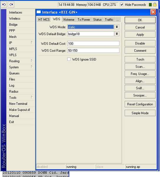 Boa tarde pessoal. tenho um enlace com mk e cartões R52hN de um lado Rb 600 e do outro Rb 433ah, o link foi configurado com WDS ativo e nstreme ta com sinal -59/60 e com trouphout de ate 55Mbit com um trafego passando neste momento de 27 Mbit. O problema e que sem mais nem menos o link cai as interfaces wireless se desconectam e voltam a se conectar posteriormente.