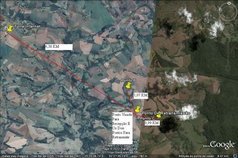 Transmissão Do Provedor 2,4 Distamcia Até O Pomto de Retransmissão 6,38 km Depois Do Ponto de Retransmissão 2 Clientes mais ou menos em um angulo de 160 graus eu calculo A Distancia Dos Cliente Fica Aproximadamente 1 km Em Anexo Imagem Google Earth Para Noção Da Instalação Anexo 32256