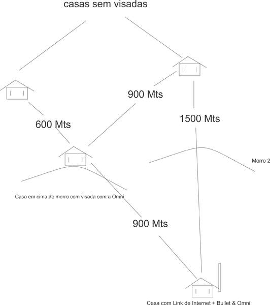 Tira a Omni + Bullet e coloca uma Nano na casa que tem o LINK mandando o sinal para a casa que está em cima do morro que tem visada e outra Nano lá recebendo, Coloca essa Bullet + Omnbi lá na casa do morro e nas outras duas uma Nano em cada uma recebendo o sinal da OMNI da casa do morro.