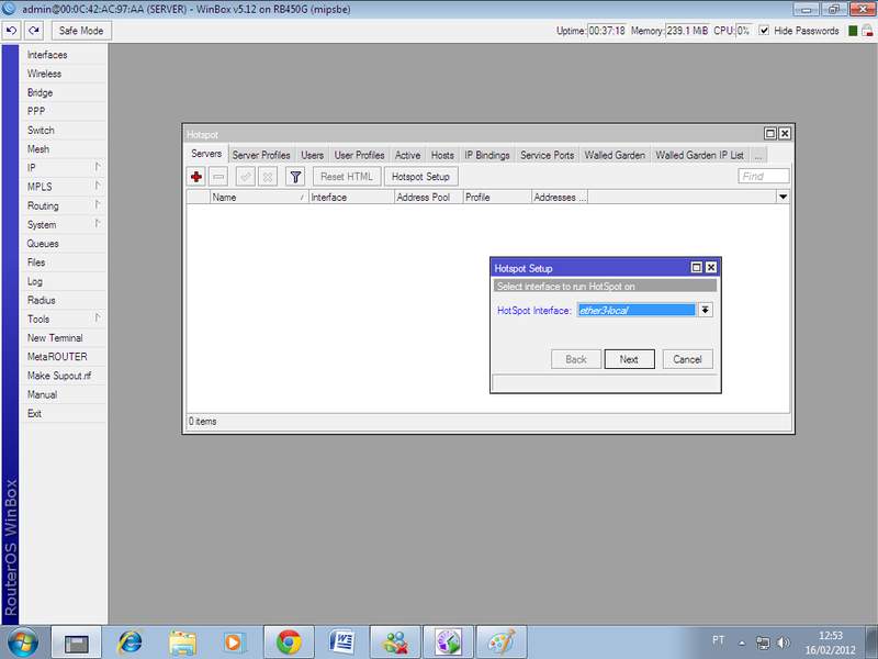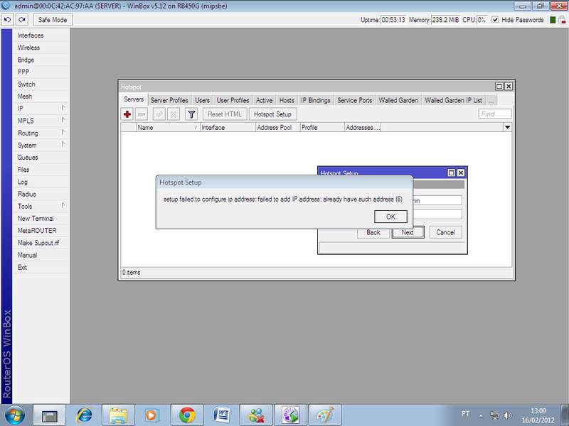 em hotspot interface>>>escolho a ether3 com o ip 10.0.0.1/24>>>adress pool of network:10.0.0.2-10.0.0.200, DNS automático, na hora de finalizar dá esse erro.tanto na ether3,ether4 ou ether5.Vou pegar a rb e passo um print.