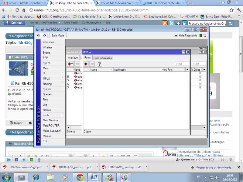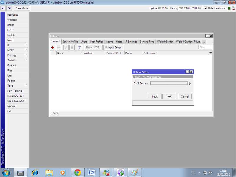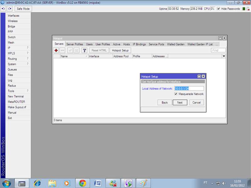 É o seguinte: tenho uma rb450g, estou tentando configura-la com hotspot, mas não tô conseguindo,crio os ips em: ip >>>address, já ciei todo e qualquer tipo de ip: 192...;10.5.50...;10.0.0.1. até aí tudo bem. Só que na hora de criar o hotspot dá o seguinte erro: