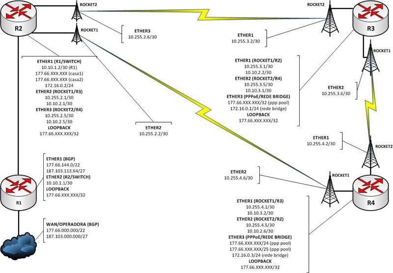 Cada base de distribuição possui uma RouterBoard na qual faz o OSPF + PPPoE Server Local,enquanto os enlaces são feitos com RocketM5.