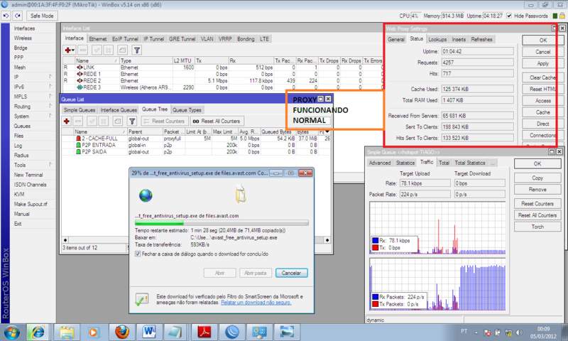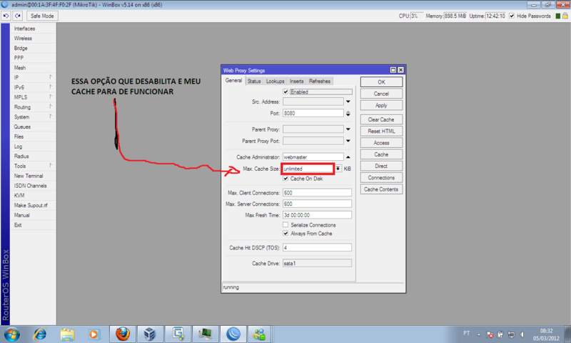 configurei o web proxy e o cache full na versao 5.14 e tudo funciona redondinho mais tenho 2 problemas, o cache fica desabilitando sozinho não sei por que a opção MAX CACHE SIZE: ela tem que ficar em unlimited serto mas com algum tempo ela muda para NONE sozinha o que eu não entendo pois o outro problema é as regras que estão no NAT as regras a pouco tempo descobrir que tem ordem e o problema é manter a ordem dela quando o servidor é desligado, se ele ficar ligado ele fica normal em relação as regras mas quando ele é desligado ou reiniciado as regras mudam de lugar. vou colocar uns prit das configurações para que possam me ajudar em relação a placa mae e as placas de redes estão na lista de compatibilidade. e já substituir a placa mãe essa é a 3 diferente que testo e os problemas continuam.
