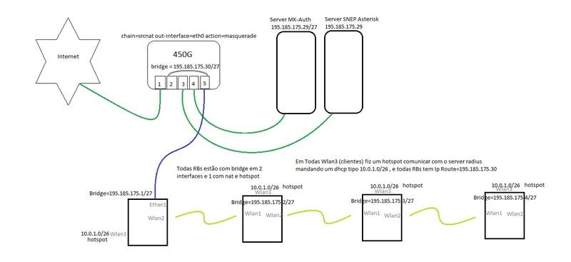 Nesse desenho que fiz (meia boca rsrs) esqueci de citar que, antes da 450G estou com uma 750 fazendo um mascaramento, e estou enviando apenas 1 ip para a 450G que vai espalhar para a rede.. isso é para teste claro, quando eu tiver condição de comprar um link mais parrudo e mais usuários na rede (que por enquanto são 48 hehe) eu faço o esquema e 1 ip por rb, e se der até 2 dependendo da quantia de usuário cada célula..