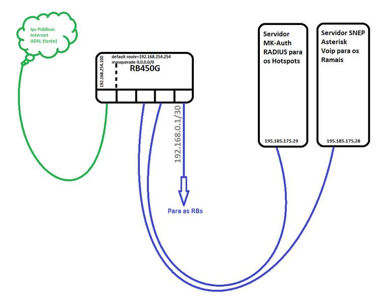 Mais uma coisinha, você saberia me informar se eu consigo jogar esses 2 servidores na rede, tentando manter os ips deles, ou mudando também não tem problema.. mas eu precisava acessar eles na rede, tanto para as RBs comunicarem com o RADIUS quanto os usuários depois do Hotspot acessarem o servidor SNEP (Asterisk) para funcionar o telefone.. só precisava uma dica de como juntar eles nessa RB bem no começo de tudo, essa RB vai receber o ip de entrada e vai fazer o mascaramento para o resto..