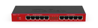 O RB2011L-IN é o modelo mais básico, com cinco portas Gigabit Ethernet, cinco portas Fast Ethernet, conector de alimentação e suporte PoE. Ele vem em uma caixa de metal coberta.