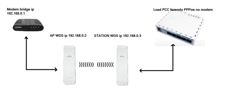 Ponto 1: PCC discando pppoe -> NS5 WDS BRIDGE -> Ponto 2: Modem dsl