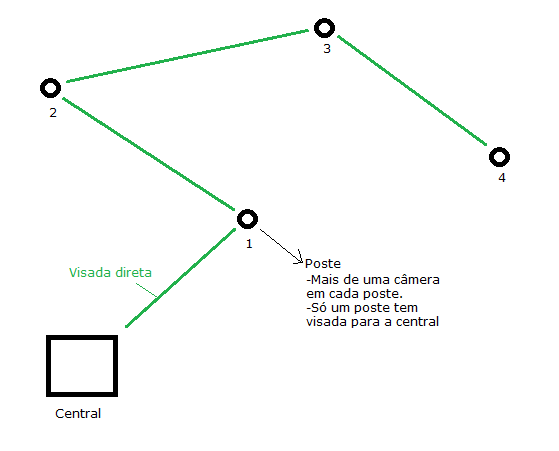 Do poste 1 para o 2 tem umas árvores só, mas do 1 para o 3 e 4 tem um prédio em frente. As linhas verdes representam as visadas, então para eu chegar ao poste 3, eu teria que passar pelo poste 1 e 2, já que não tem visada para a central.