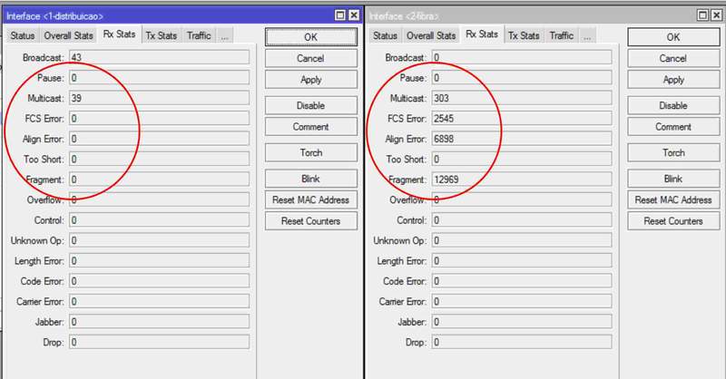 Notamos que começou a perder pacotes para fora, e de qualquer cliente ate a RB não perde nenhum. Notei que aparecem alguns erros na “RX STATS” conforme figura em anexo, alguém sabe me dizer o que pode ser isso??