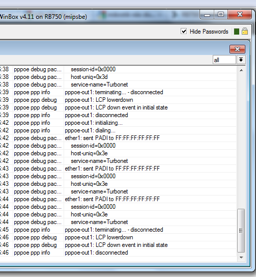 estou com um problema bem parecido, ocorre com uma RB1200 em um adsl de 100mb, no de 35mb ele disca e funciona normal, no de 100mb que é um conversor de midia da GVT não vai, no debug apresenta a mesma falha.