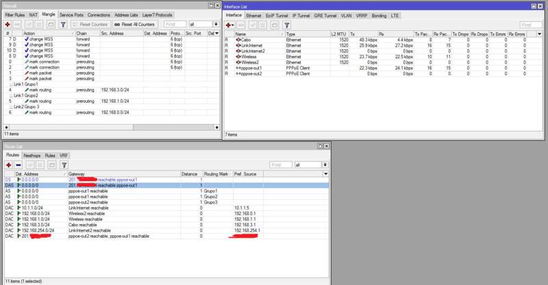 Olha ai as configs. Ta tudo funcionando dessa forma ai, só que perco acesso aos radios e modens. Todo trafego do Grupo 1 e 2 ta indo pra PPPOE-out1 (linkinternet) e todo trafego do Grupo3, que no momento tava sem passar nada, vai pro PPPOE-out2 (Linkinternet2), até ai blz, mas pq perco acesso aos radios e modens? Olhe a imagem ai pra mim e vejam o que ta errado: