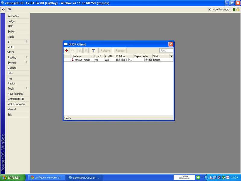 Como que tá o teu modem: bridge ou roteado? Se tiver roteado, vai na rb, ip >>>DHCP client>>> + como na imagem abaixo...