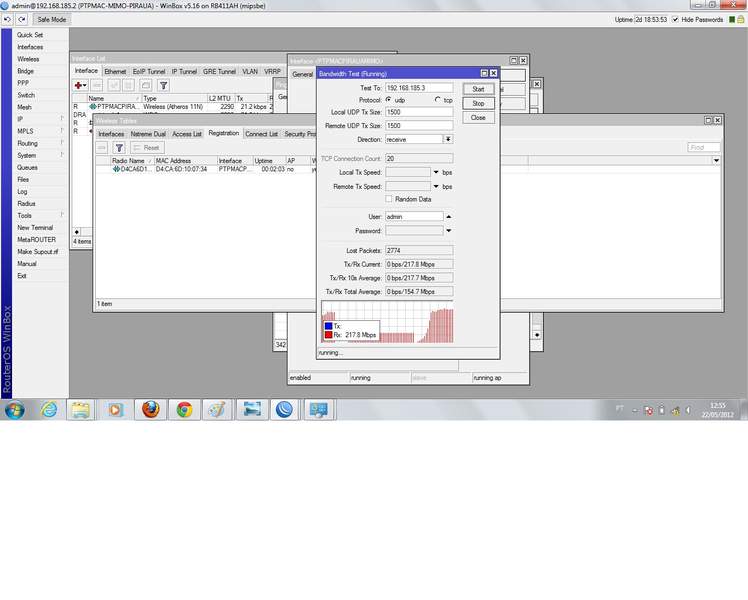 No teste em udp consegui algo fantástico, pouco mais de 200mb, só que em tcp nao passa de 64mb, gostaria do auxílio de vocês, acredito que essa limitação em tcp se deve ao processador da RB que ja tá no gargalo, no entanto se vocês tiverem alguma dica será bem aceita.
