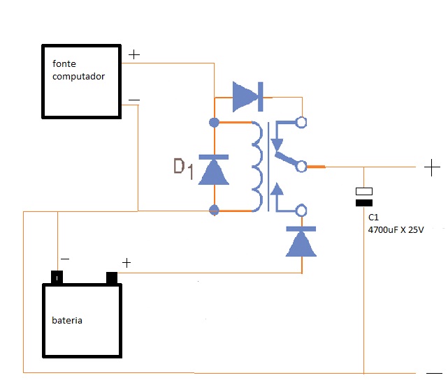 Preciso de um projeto de carregador flutuante aproveitando a fonte de computador atx, hoje uso nos meus pops a alimentação fornecida por fonte de computador alimentando um switch 8P intelbras modificado, fornecendo alimentação poe em todas as suas portas facilitando a colocação de novos equipamentos. A fonte de computador fornece 12v 12A, com relé acionado pela propria fonte que com a falta de energia desliga o rele e entra alimentação pela bateria. Tem um condensador de 4700uF X 25V que evita na transição da fonte para bateria que o equipamento reenecie. O problema é carregar a bateria após a descarga, queria aproveitar a própria fonte para fornecer a carga para a bateria mas teria que ser flutuante, visto que a fonte vai estar fornecendo carga constante.