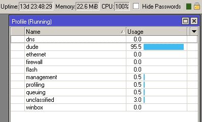 Olá, percebi hoje que em um dia minha RB1100 subiu o CPU e RAM para 100%, tudo por causa do DUDE.